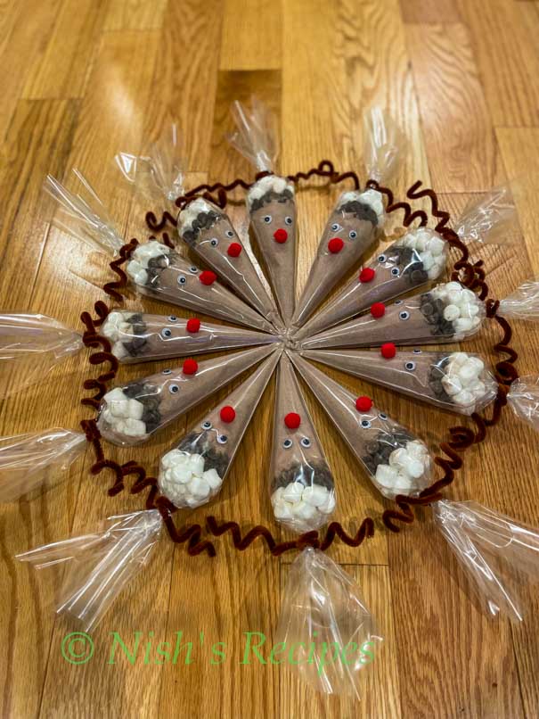 Reindeer hot chocolate cone is a festive cone filled with coca mix, chocolate chips, mini marshmallows that pour into a mug add hot water or milk. This is one of the best and cheapest holiday gift.